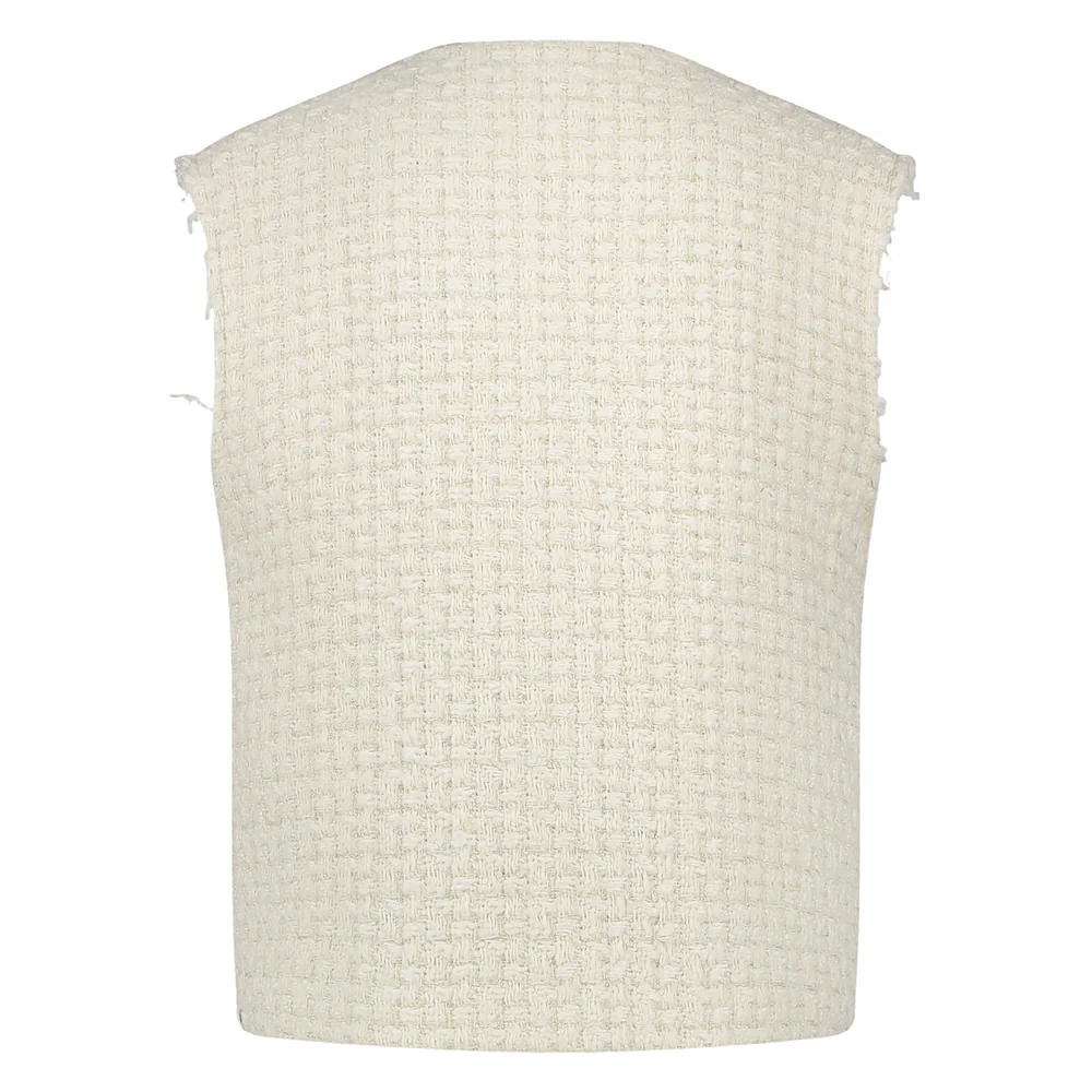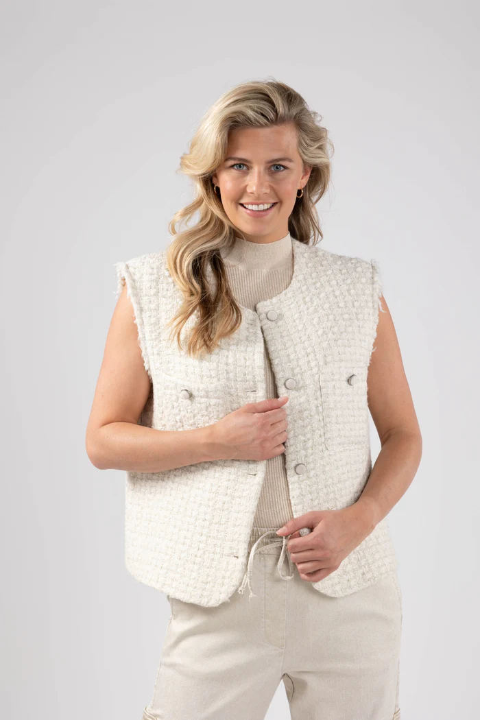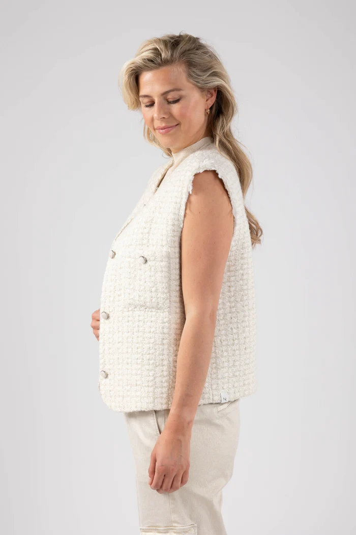 Het Arabella Gilet Lurex van Nukus is een blikvanger met zijn zilveren en gouden lurex-stof en stijlvolle witte knopen. Voorzien van twee borstzakken, een klassieke ronde hals en een afgeronde onderkant, biedt dit gilet een perfecte combinatie van flair en functionaliteit.