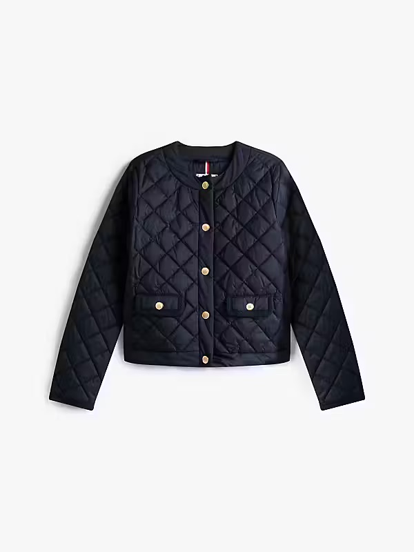 Deze korte stepjas van Tommy Hilfiger met een vulling van echt dons. De jas heeft gouden knopen en een ronde hals.
